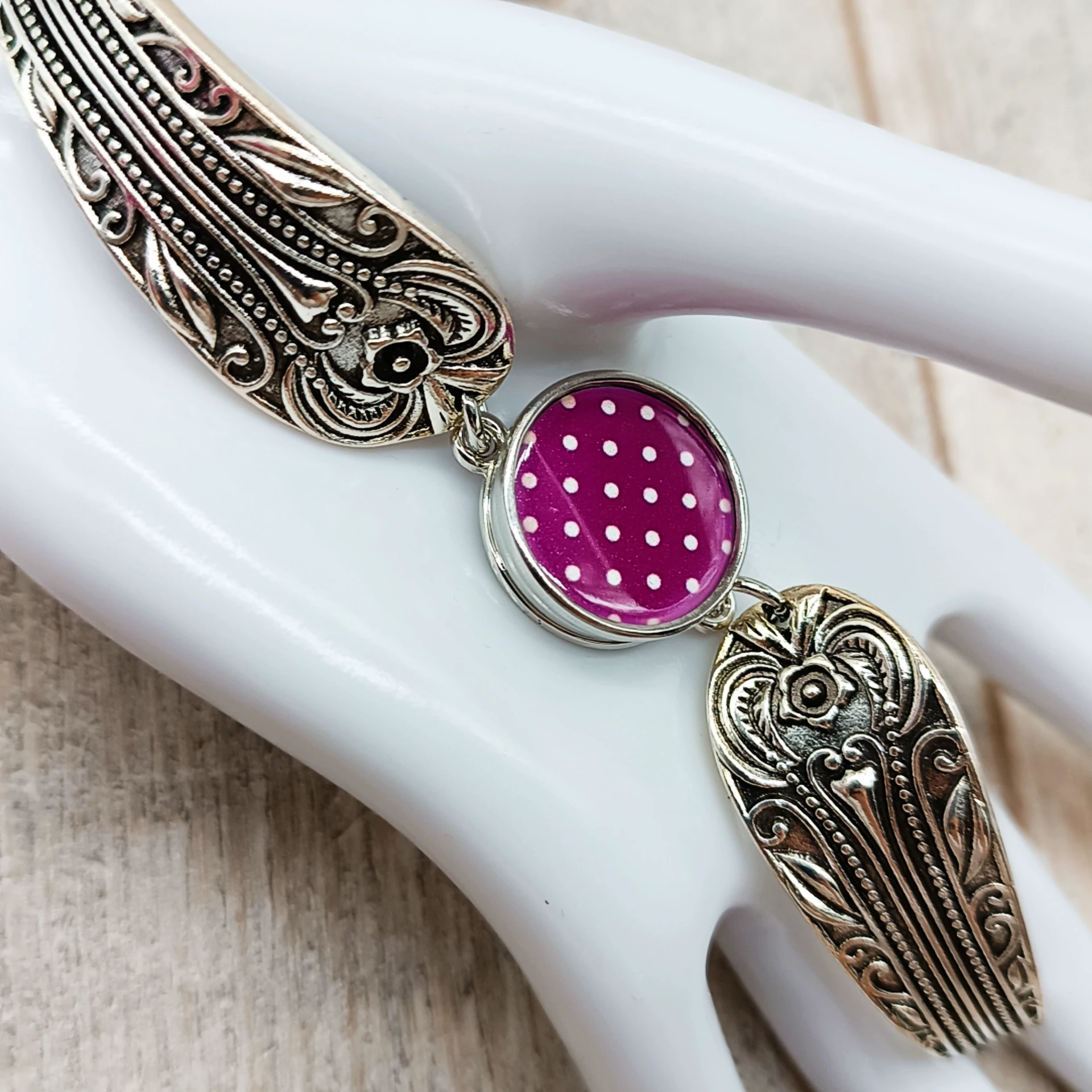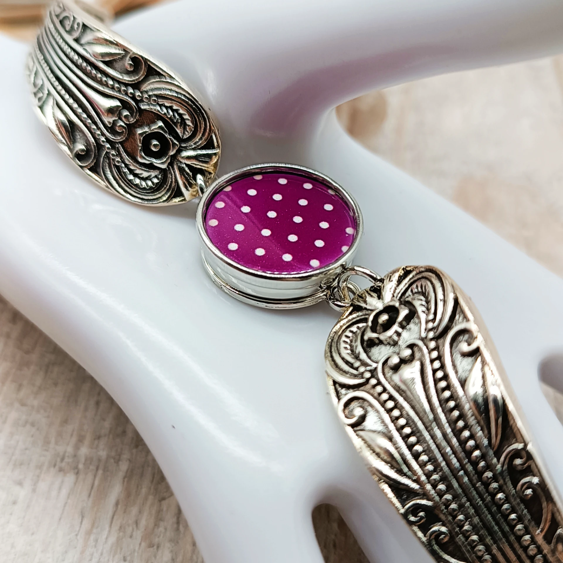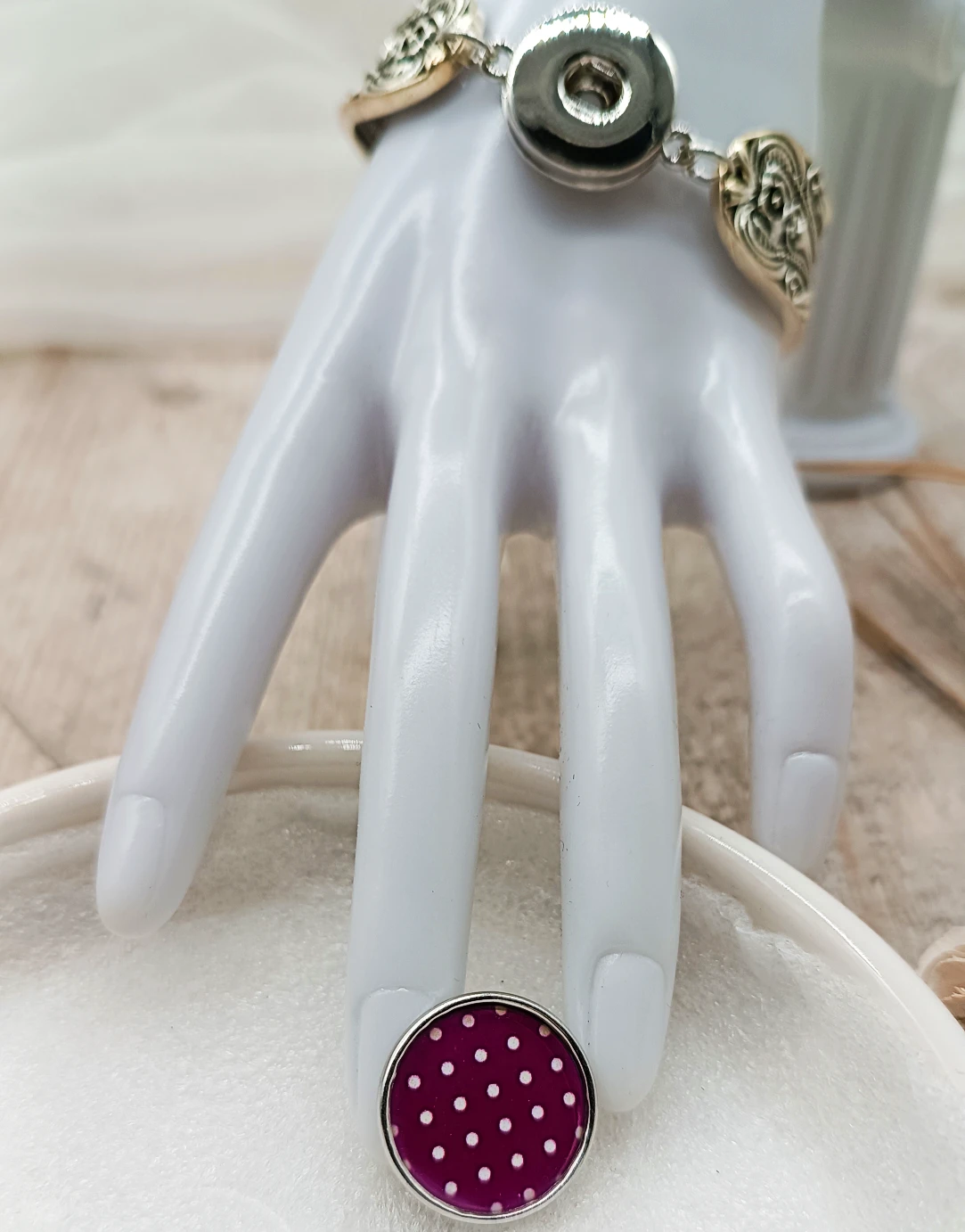 Le bracelet Élégance Bohème – Framboise séduit par ses pièces métalliques finement travaillées aux motifs arabesques, associées à une facette ronde rose framboise à pois blancs, signature rétro et joyeuse.