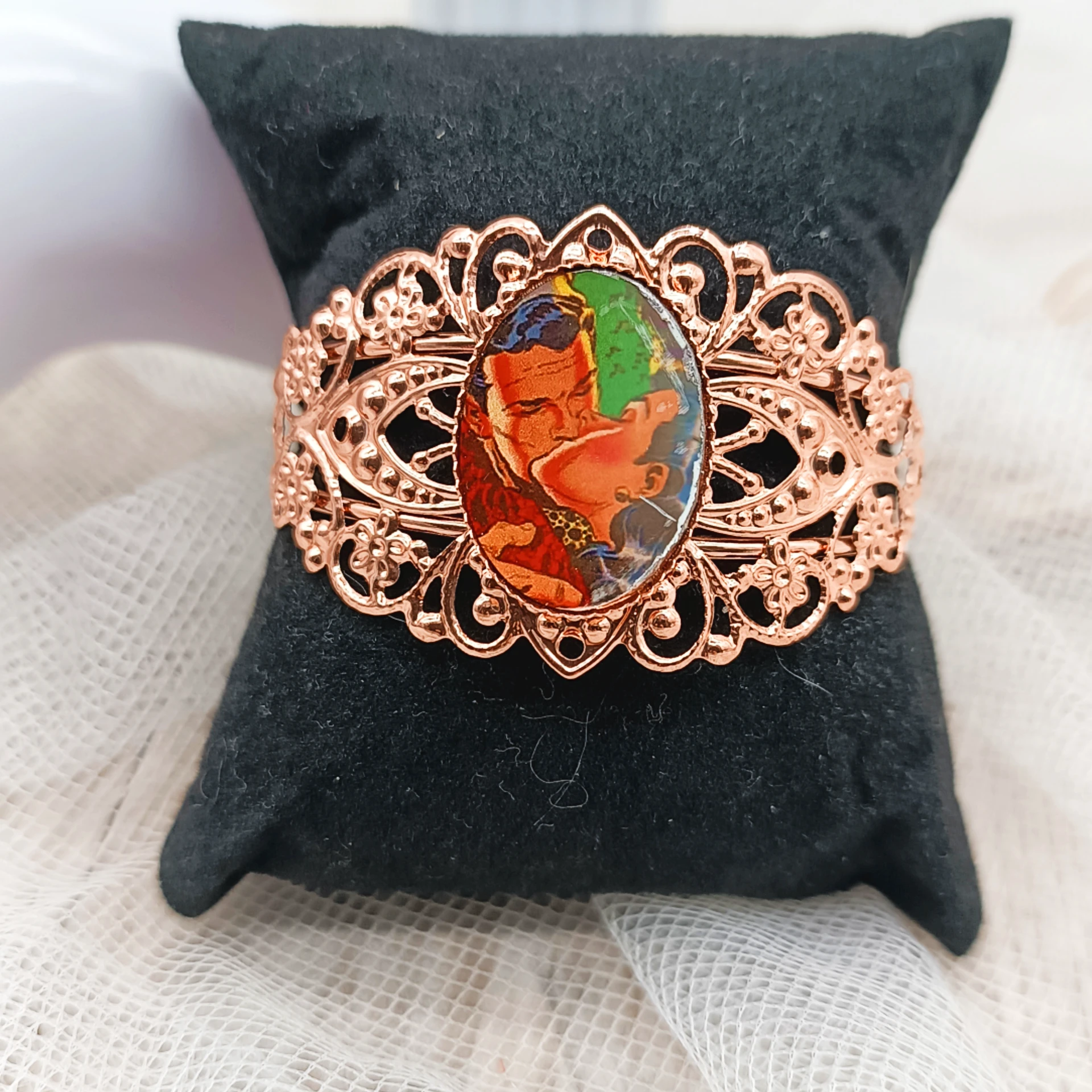 Son support ajouré en métal doré rose accueille un médaillon orné d’une illustration inspirée des bandes dessinées vintage, représentant un couple s’embrassant.