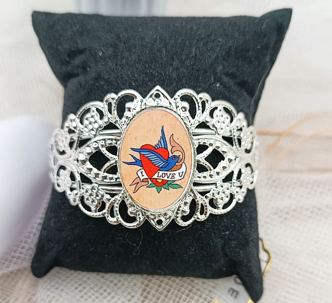Plonge dans l’univers du tatouage old school avec ce magnifique bracelet Love Bird, symbole d’amour et de liberté.
