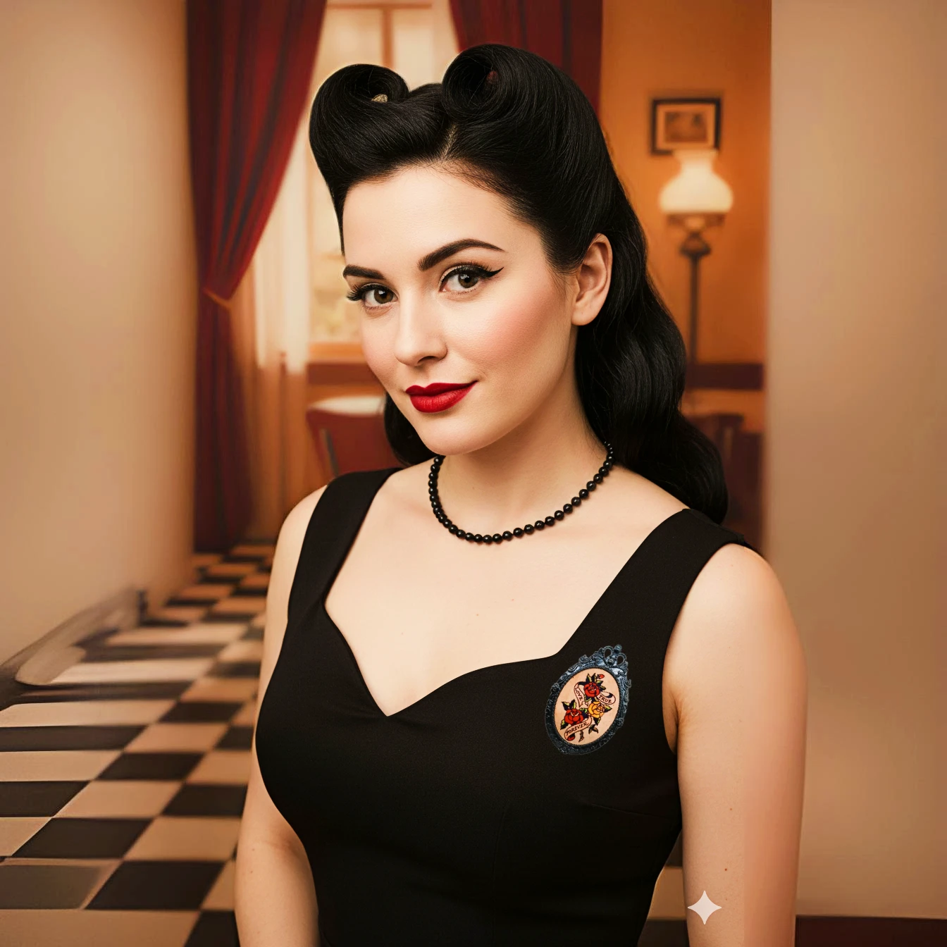 Son cadre noir ajouré ajoute une touche d’élégance sombre et romantique, parfaite pour accessoiriser vos vestes, sacs ou robes rétro.