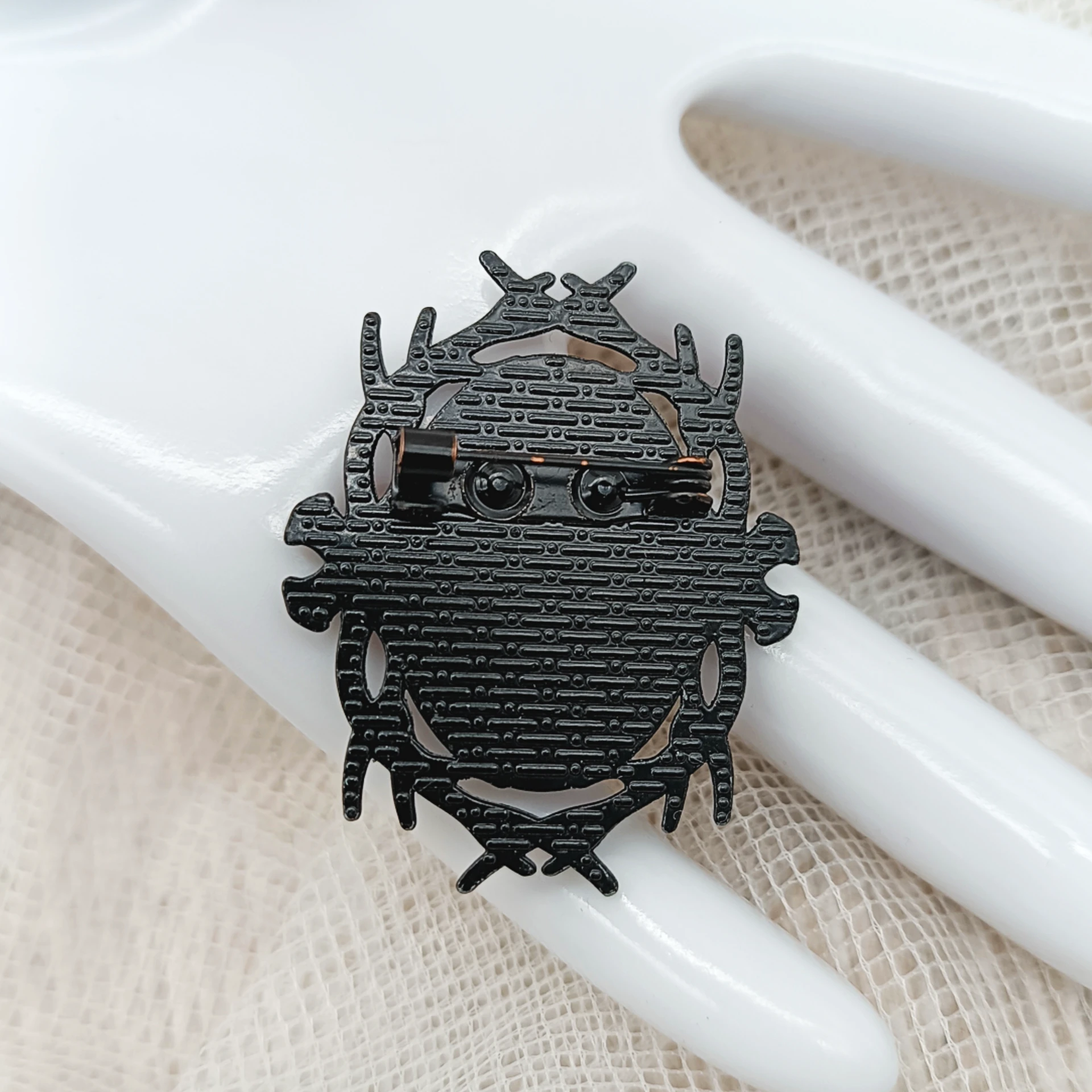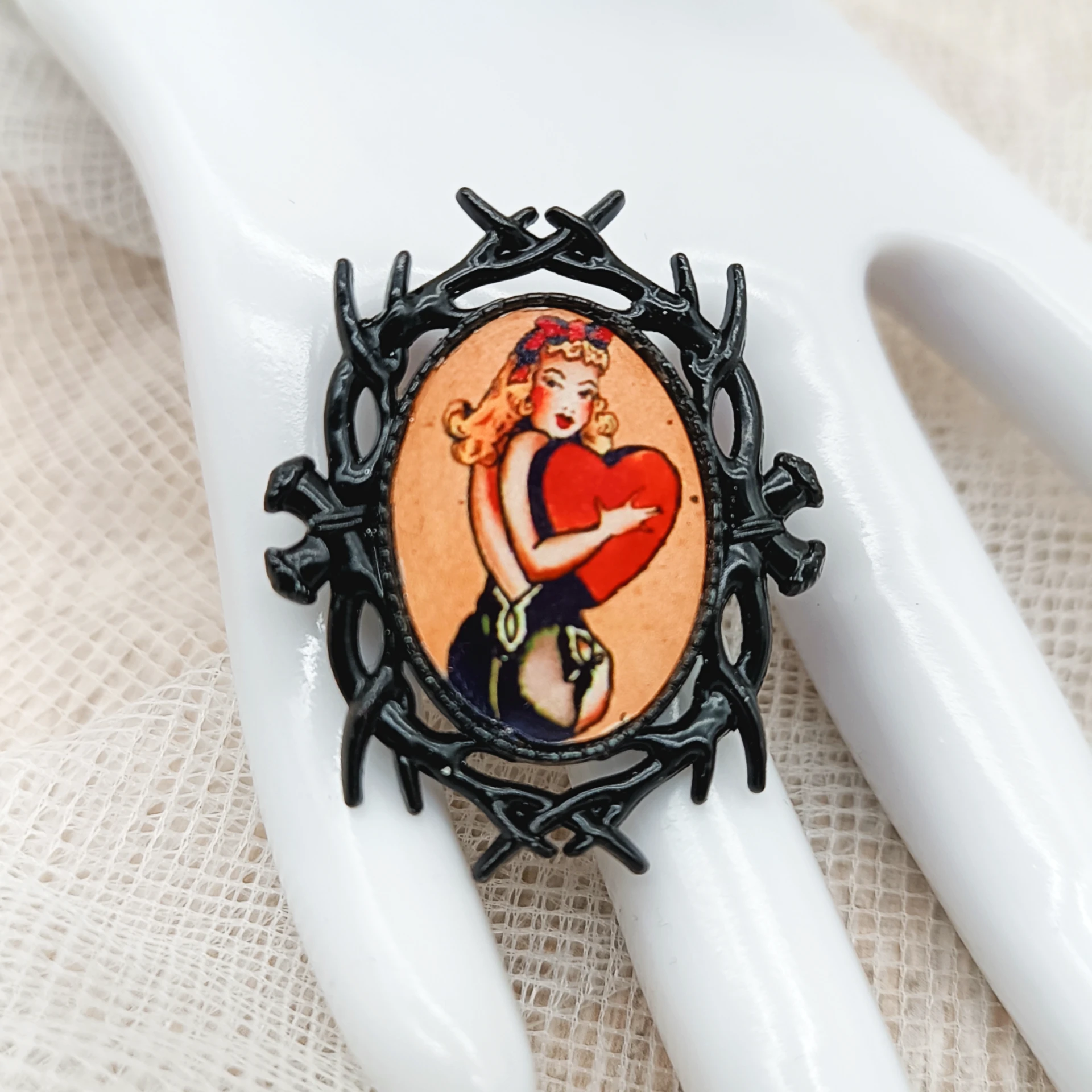 Un bijou délicieusement rétro ! Cette broche Sweetheart Pin-up, met en scène une pin-up glamour enlacée à un cœur rouge passion, le tout encadré d’une monture noire au style baroque moderne. Elle ajoutera instantanément une touche romantique et vintage à vos tenues.