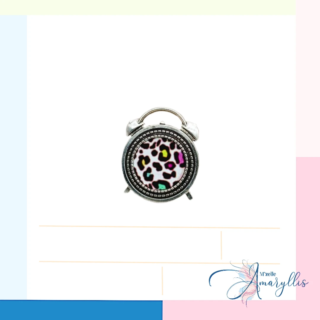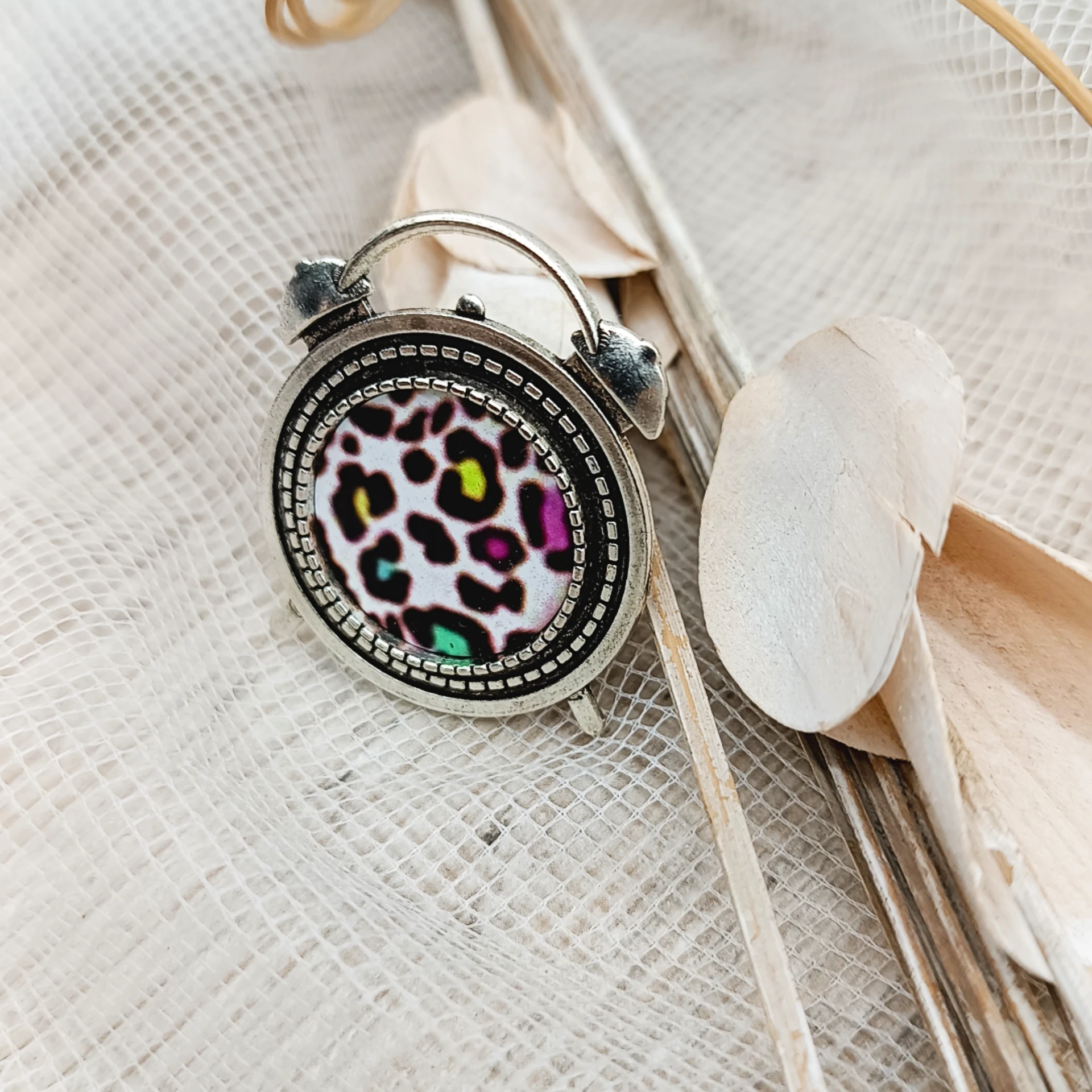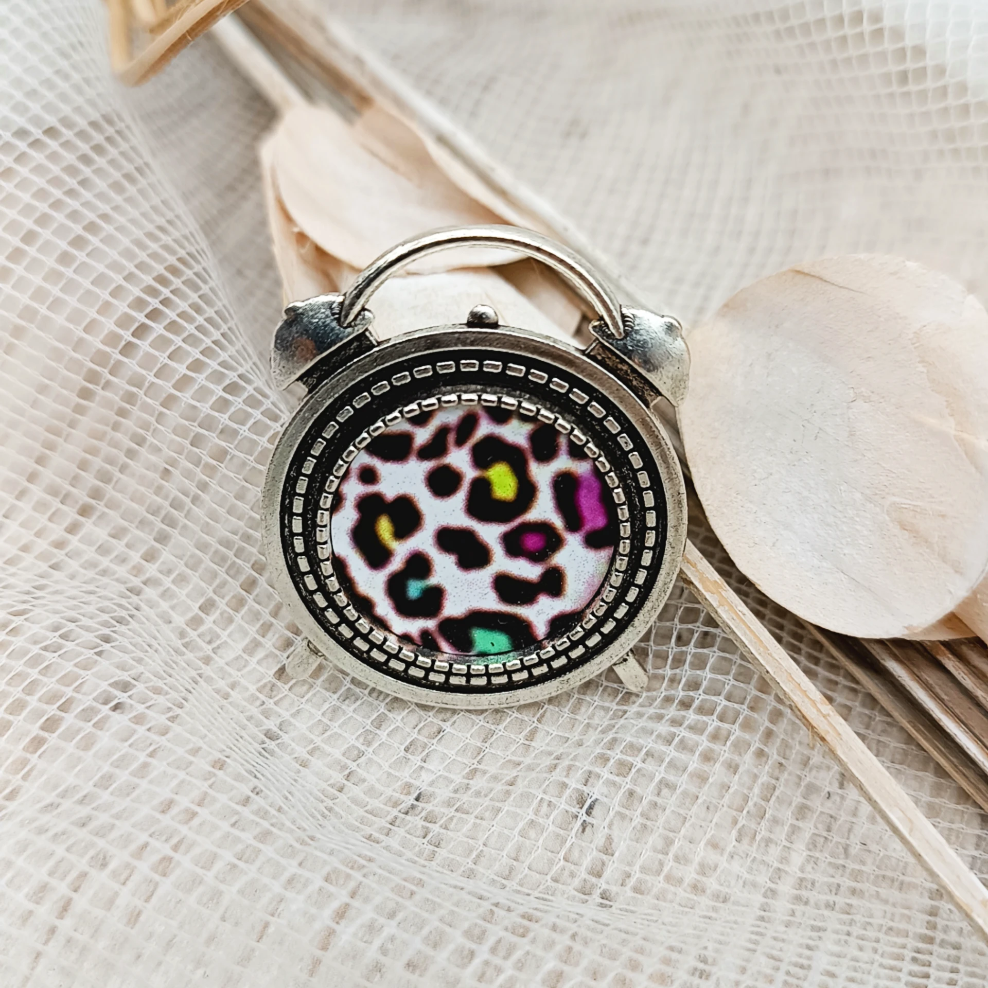 Sa forme de petit réveil argenté, ornée d’un motif léopard multicolore, en fait un accessoire original et pétillant — parfait pour sublimer une veste, un foulard ou un sac à main.