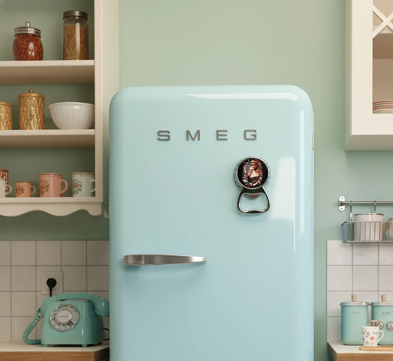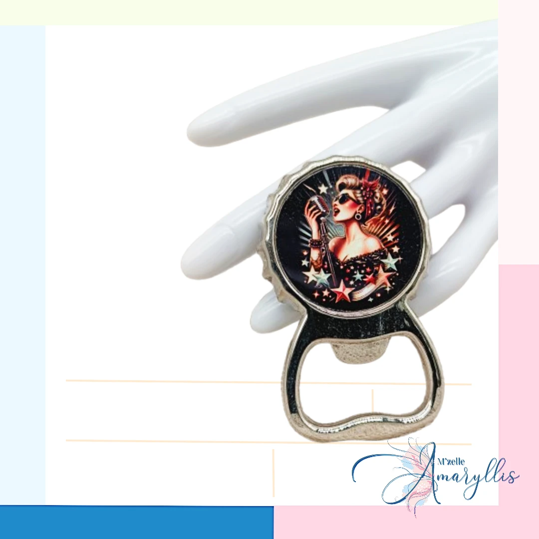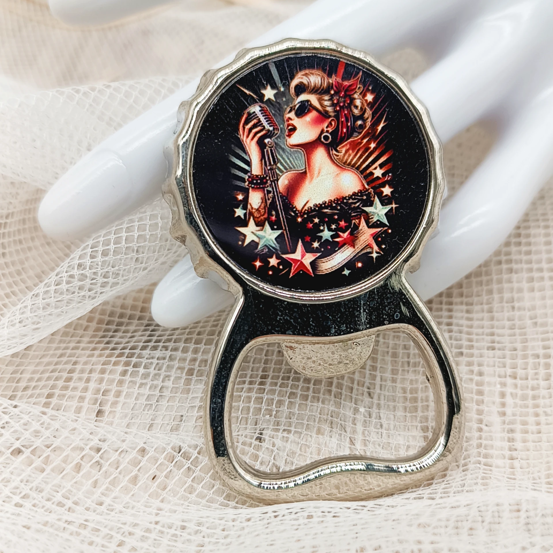 Un accessoire pratique avec du style ! Ce décapsuleur Rock’n Star aimanté unique met à l’honneur une pin-up en pleine performance rock’n’roll, micro rétro à la main et étoiles flamboyantes en arrière-plan. Une création exclusive signée M’zelle Amaryllis 🌟