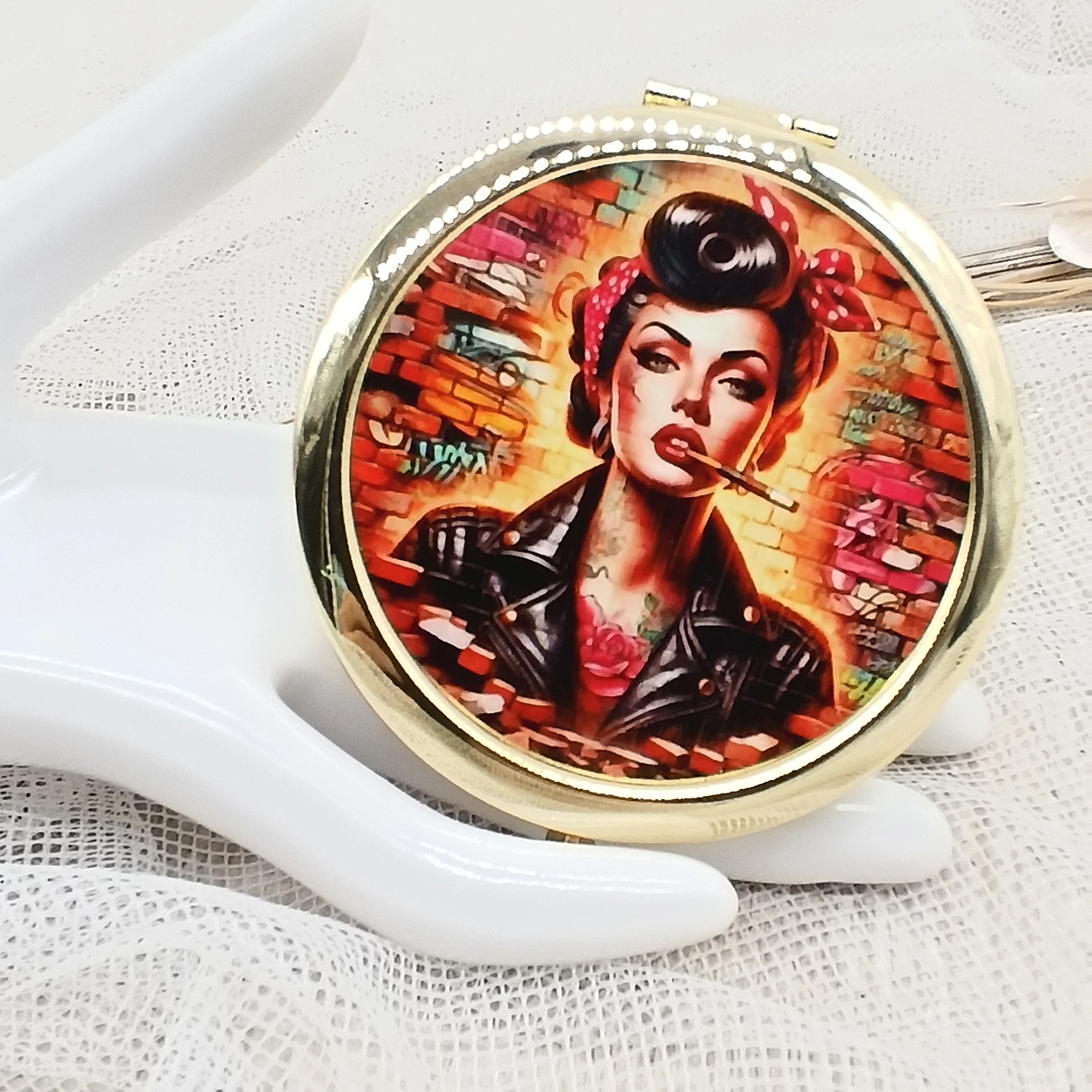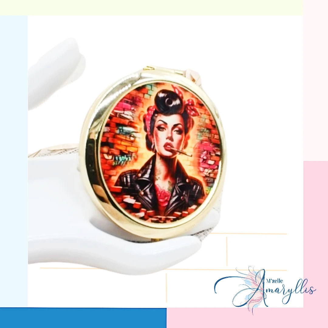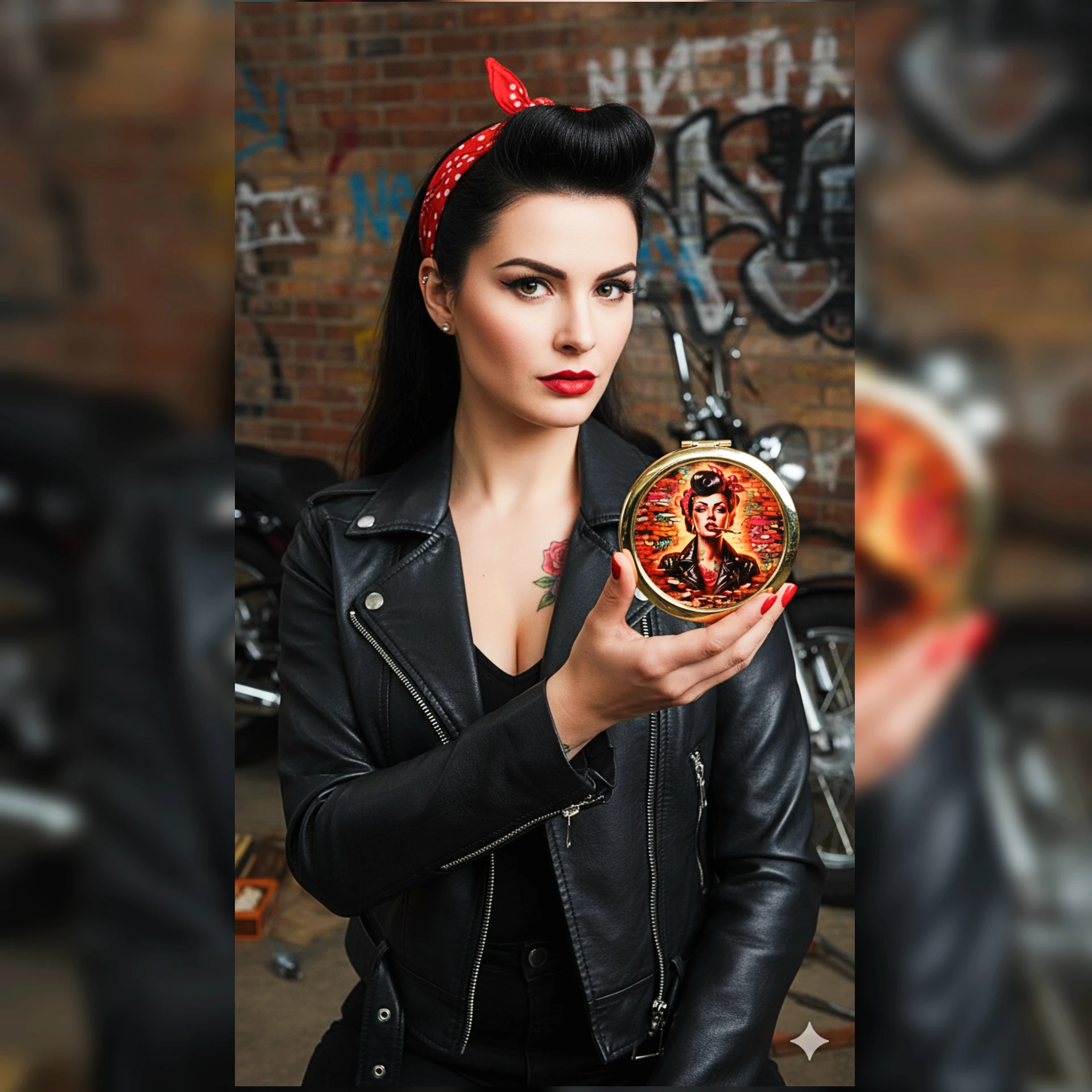 Inspiré des pin-up des années 50, il mêle féminité et esprit rock. Sa finition dorée met en valeur une illustration éclatante représentant une pin-up biker au look rebelle et glamour.