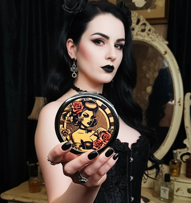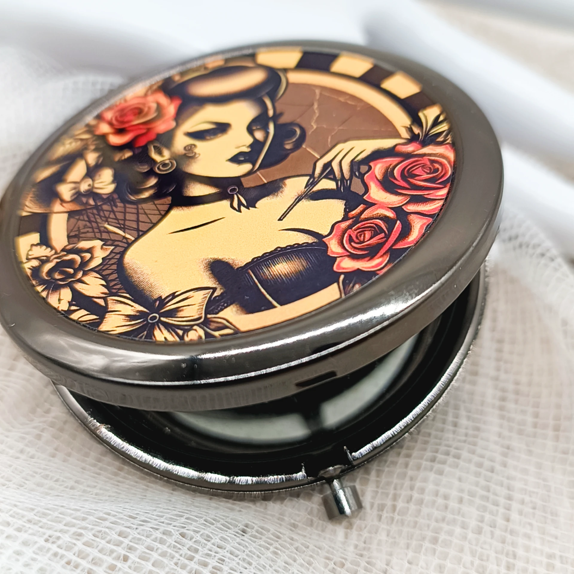 Plongez dans l’univers rétro avec ce miroir de poche unique, orné d’une illustration exclusive signée M’zelle Amaryllis. Son design glamour et rebelle met en avant une pin-up entourée de superbes roses rouges, pour un accessoire aussi pratique qu’élégant.